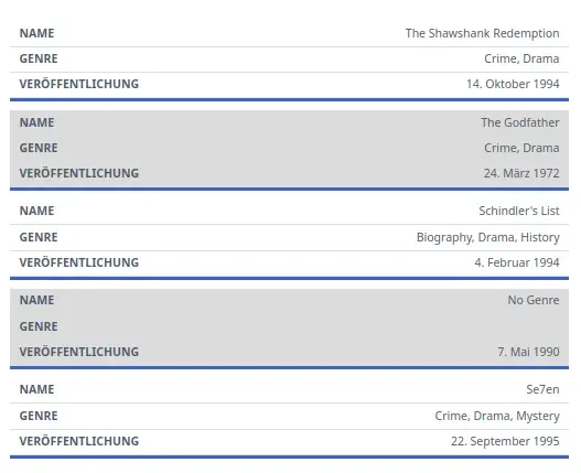 Mit einer manuellen Funktion des Hadron Themes werden Tabellen auch auf mobilen Geräten gut dargestellt (hauptsächlich bei breiten Tabellen nötig). Die Tabelle wird dann wie folgt dargestellt: